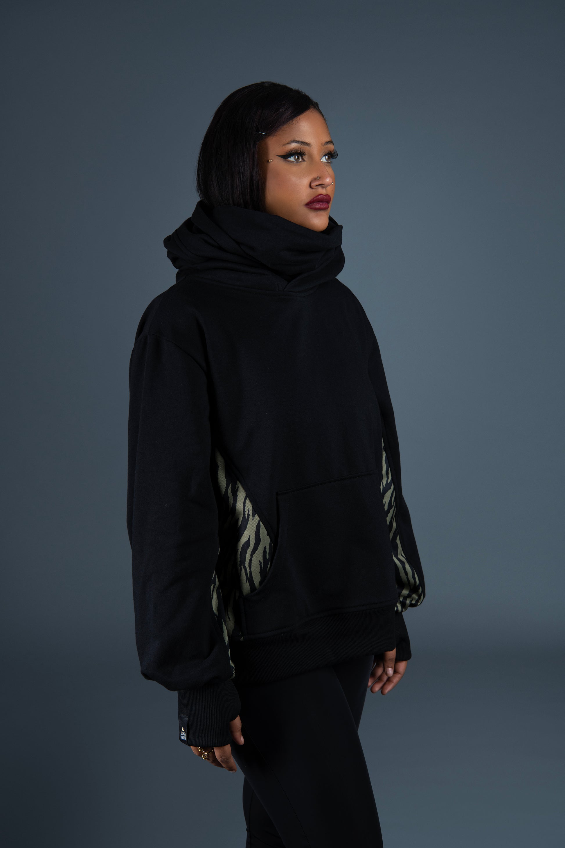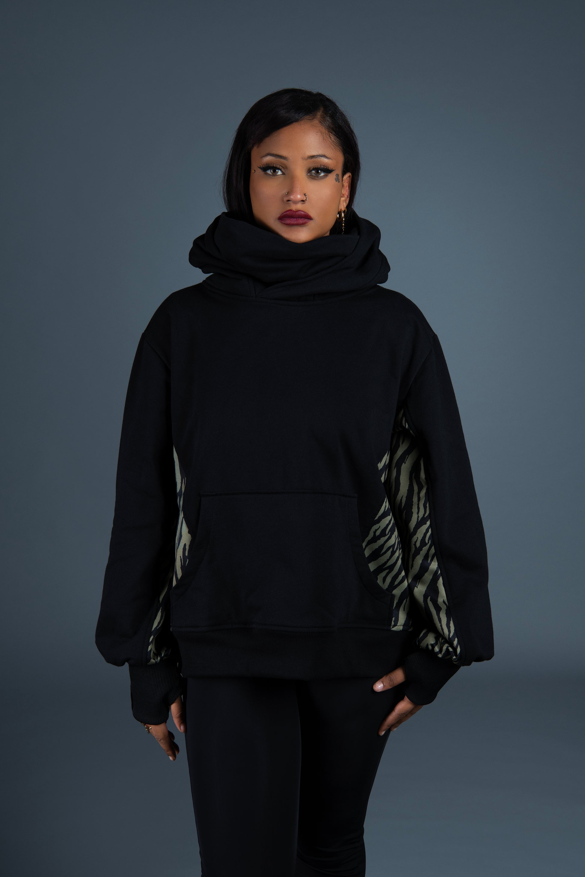 With bold snake accents, oversized fit and a built-in snood, this hoodie is made to face the cold in comfort and attitude.