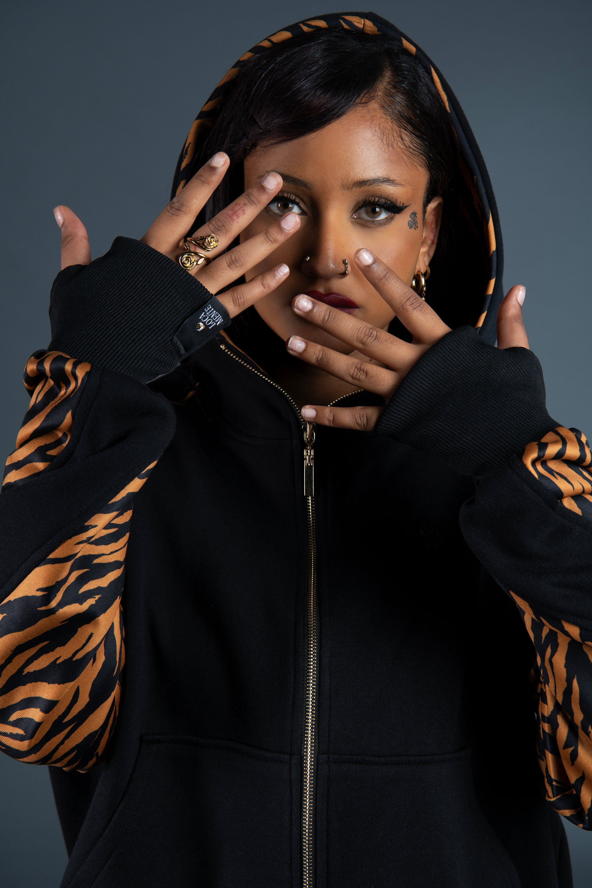 ✦ Golden zipper and thumb holes